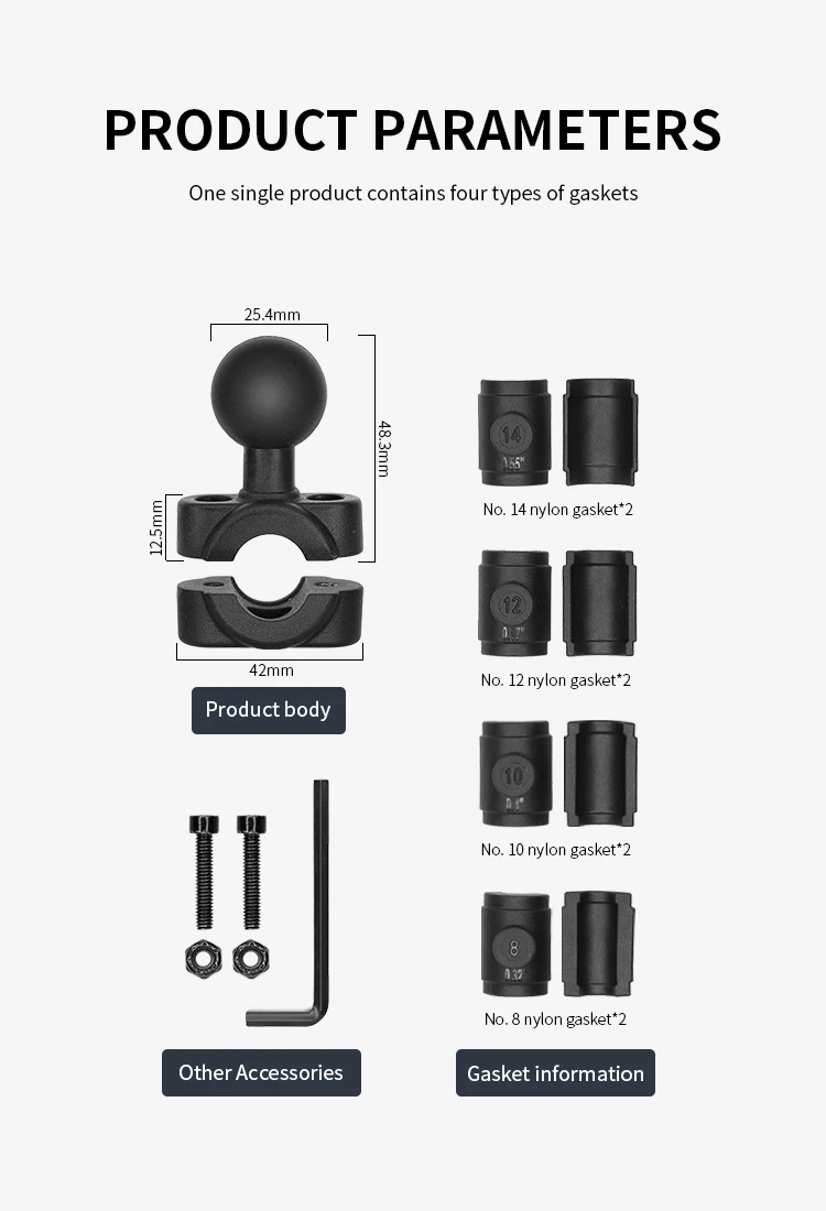 compatible with rails 0.32” to 0.55” in diameter. Sizing inserts are included to provide a tight fit