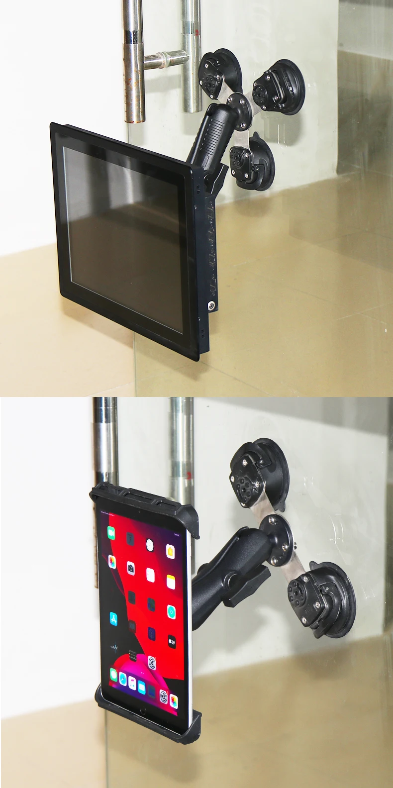 The double suction cup size is 91x271mm, standard load capacity: 1kg; heavy duty: 2kg, can be attached to the car windshield or other glass and installed by connecting the C-size connecting rod and the device.