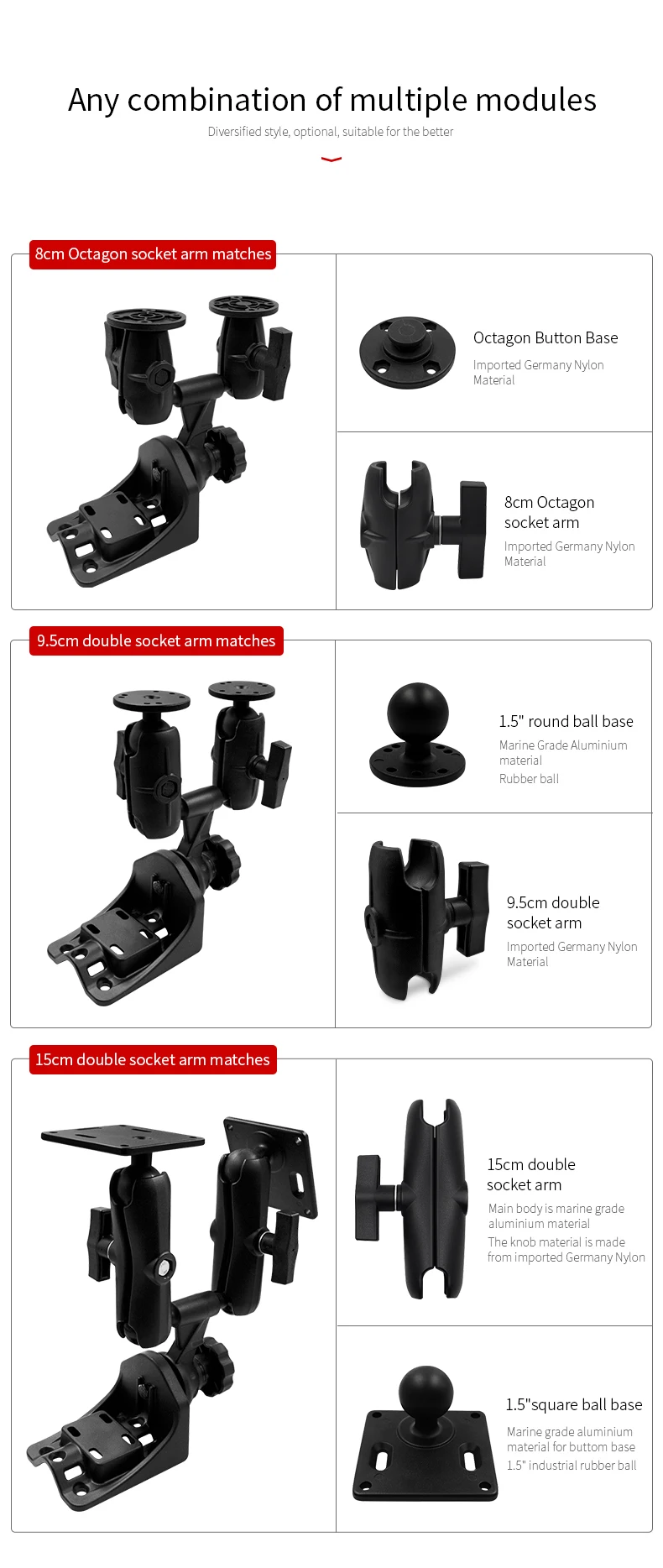 mounting base. At the free end of the mount swing arm is Two round 1.5" diameter ball.