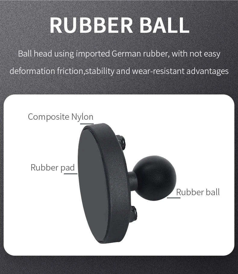 Feature of Magnetic base: consists of a 1" diameter rubber ball connected to a flat 2.65" diameter base and triple magnetic base adapter. The 2.65" diameter base contains pre-drilled holes, including the universal AMPS hole pattern. The magnetic base adapter contains 3 rare earth magnets that hold firm to ferrous metals. Simply put this product near the mounting surface and feel it almost jump out of your hand. The composite adapter designed to conceal the magnets is made of durable composite to prevent scratching the mounting surface. Ideally suited for many applications, you're sure to find many ways to use your new magnetic mount at work, home, on the go, or at play.