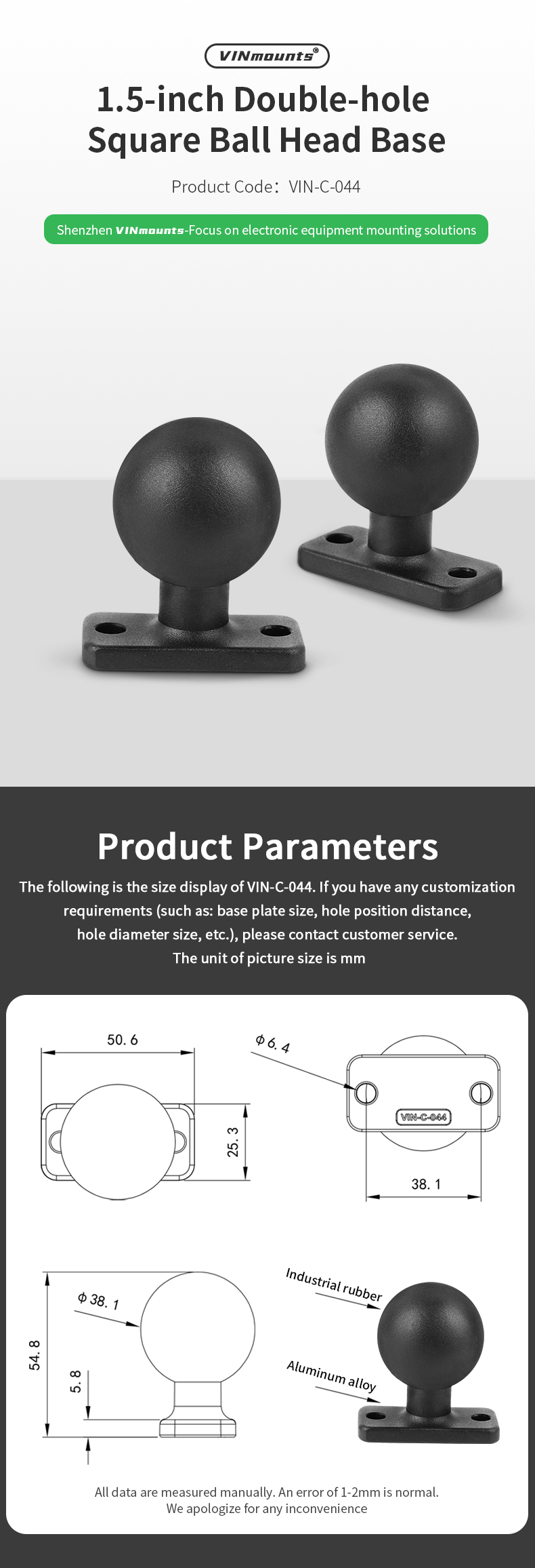 The VIN-C-044 is a heavy-duty C size ball mount designed for secure and versatile mounting solutions in vehicles and industrial applications. It features a 1.5-inch diameter rubber ball firmly connected to a rectangular base plate with a 2-hole pattern measuring 1.5 inches (38.1mm) from center to center. This design provides strong stability and compatibility with a wide range of mounting systems.