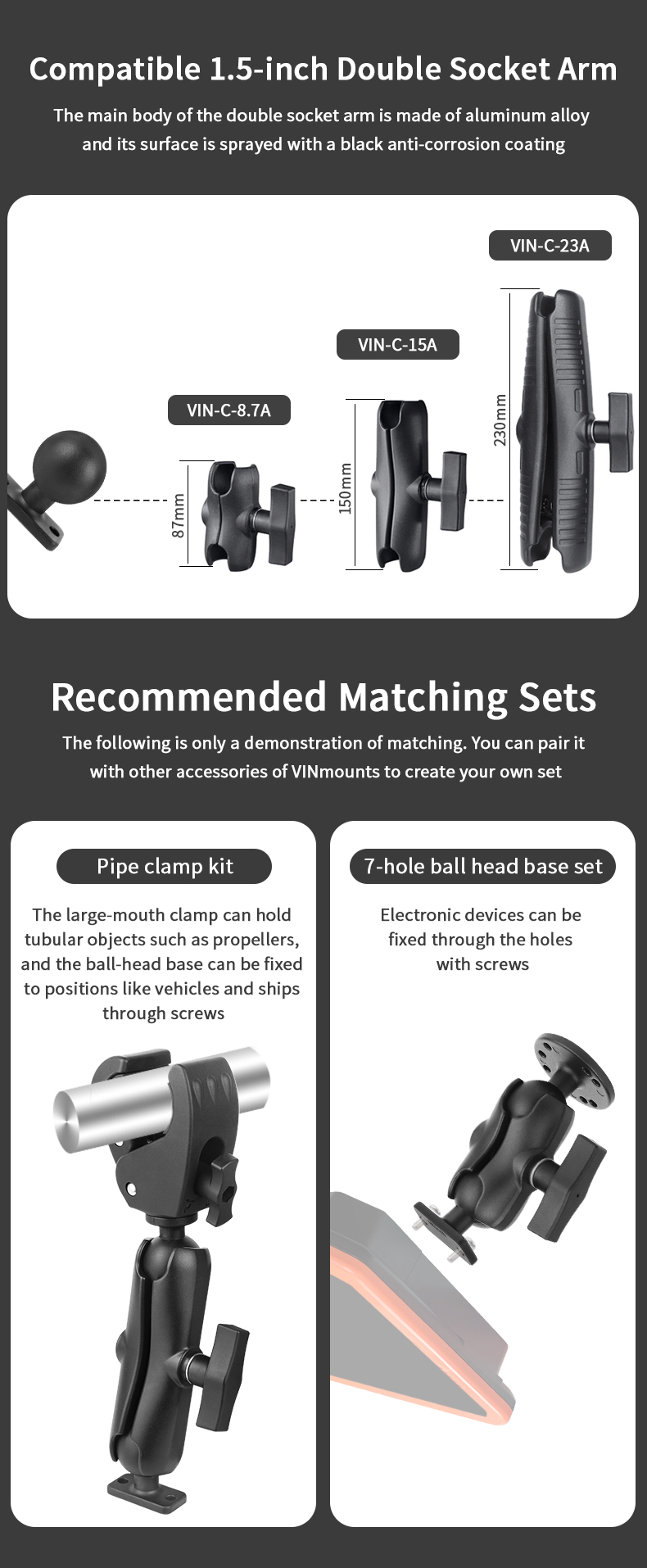 The VIN-C-044 ball mount is compatible with C size mounting arms and brackets, offering flexible adjustment and a secure hold even in rugged conditions. Whether used for professional fleet management, off-road driving, or industrial monitoring, this ball mount delivers long-lasting performance and adaptability.